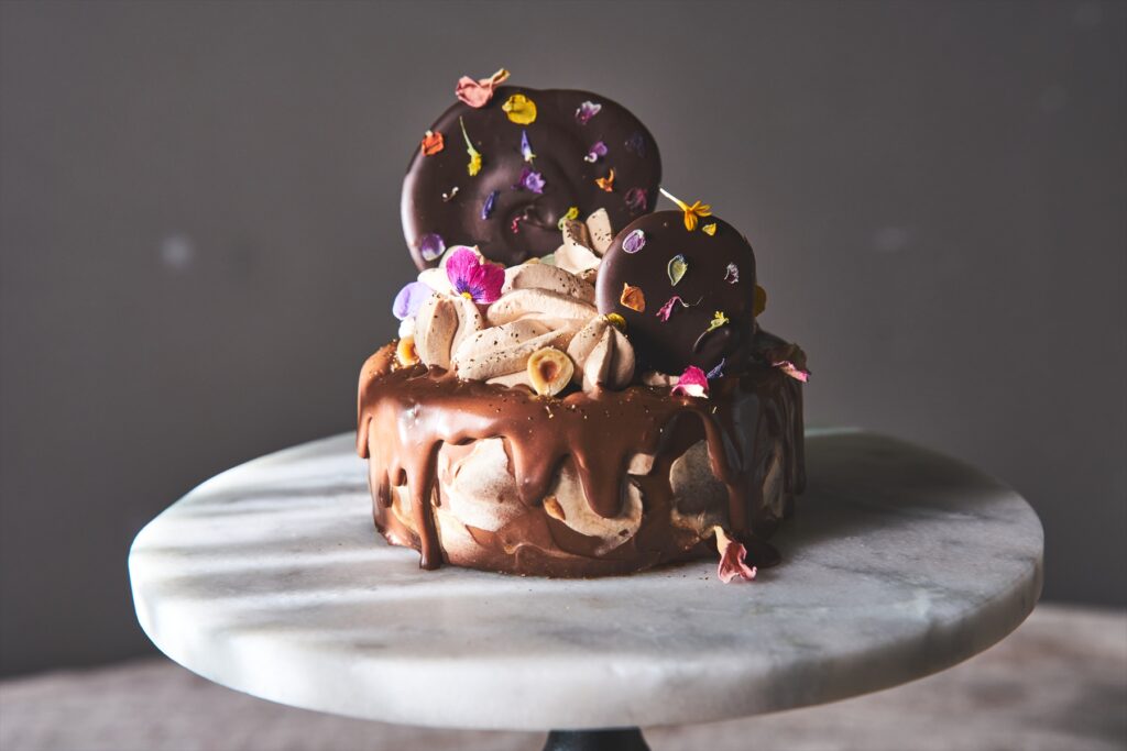 ミルクとビターが重なり合うチョコレートムースに、軽やかなシャンティと香ばしいフロランタン。
