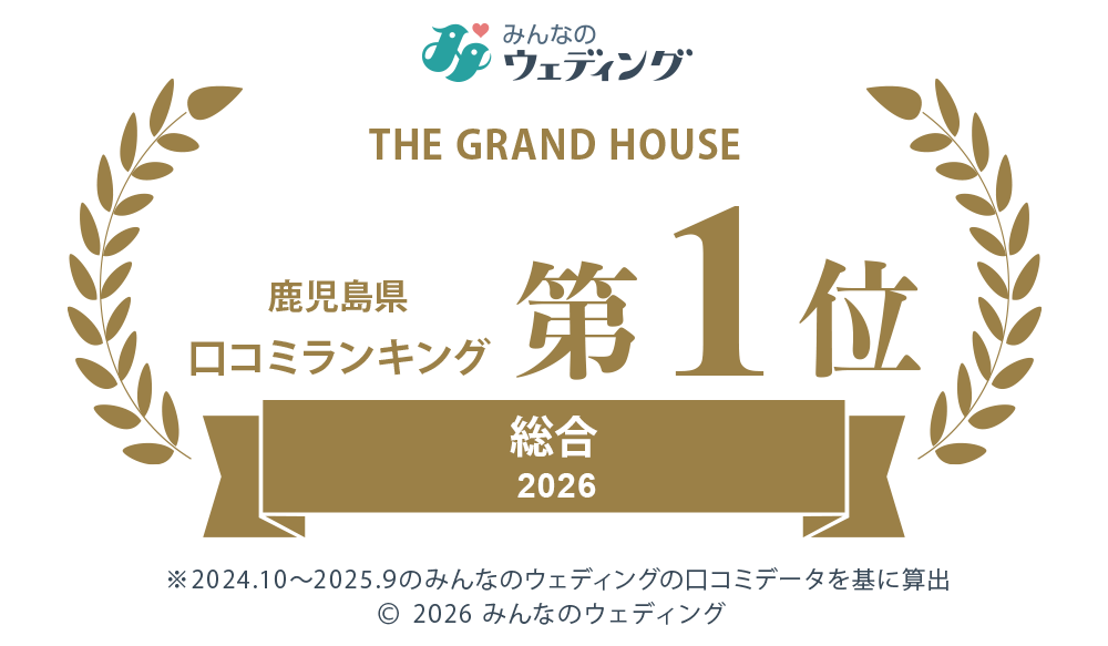 鹿児島県すべての結婚式場にて、料理、演出、スタッフなど、様々な評価軸で高い評価を頂き、口コミ総合ランキング第一位を受賞しました。